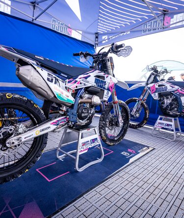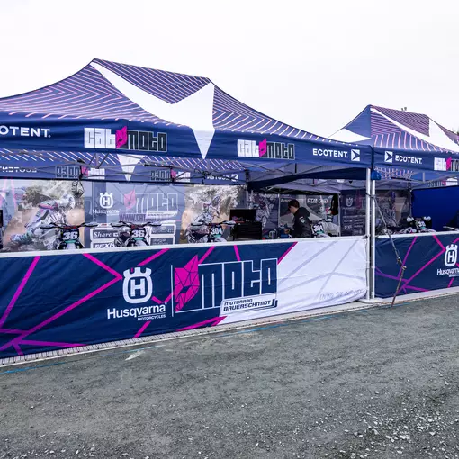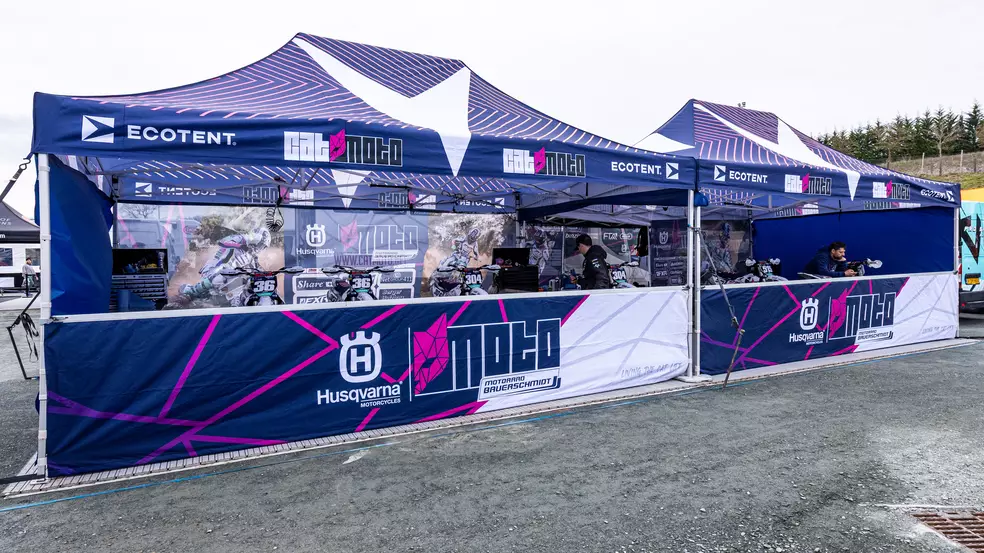 Cat Moto Motocross Team’s race bikes under Ecotent pop-up gazebos.